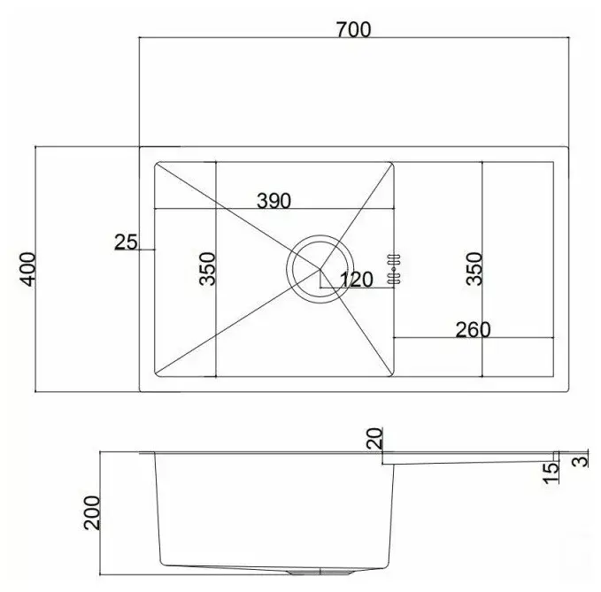 Мойка имеет популярные размеры 700 x 400 мм и R5 радиус закругления. Внутренние углы с радиусом закругления R10.