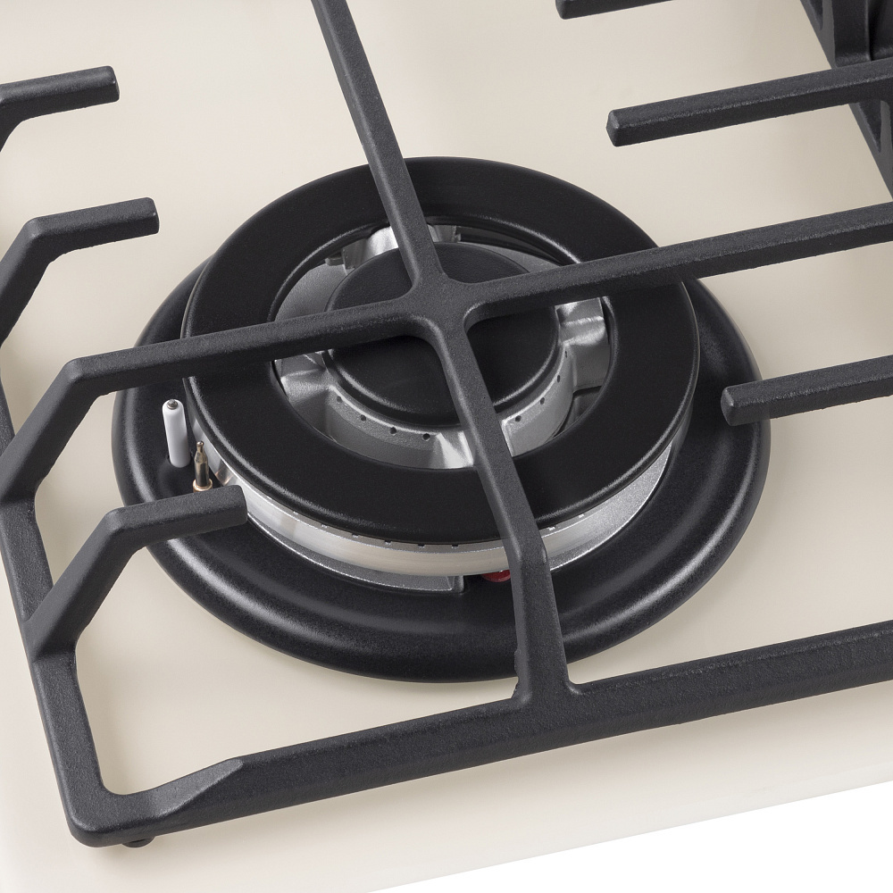 4 газовые итальянские конфорки.Фронтальное управление, 4 поворотных переключателя, автоматический электроподжиг под ручкой управления, возможность работы от магистрального газа и газа в балоне (тип G30).